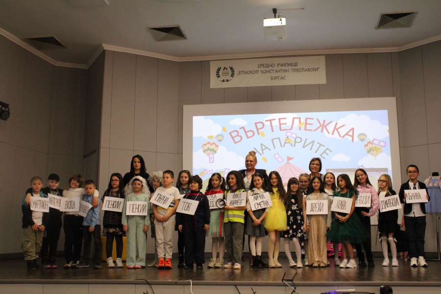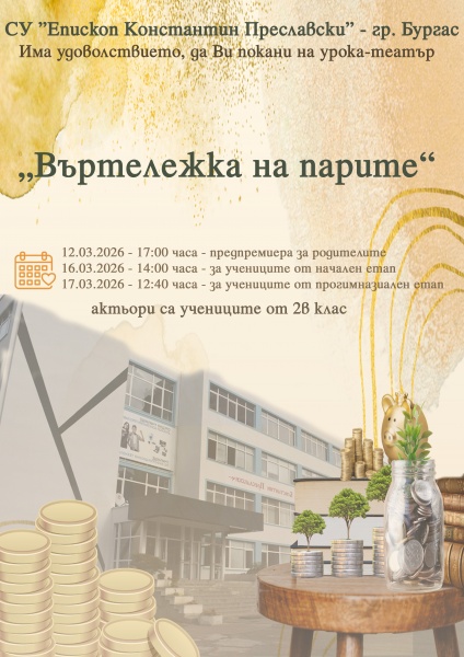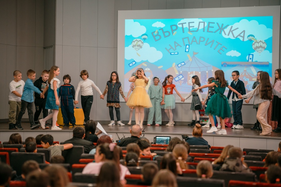 Урокът-театър „Въртележка на парите“, представен на 12.3.2026 г. от учениците от II.в клас пред техните родители, учители и приятели, се превърна в една наистина вълнуваща и незабравима вечер. Малките актьори вложиха сърце и талант в изпълнението си, а публиката ги възнагради с топли аплодисменти и усмивки. Емоцията беше силна и искрена – спомен, който ще остане завинаги както за участниците, така и за всички зрители.